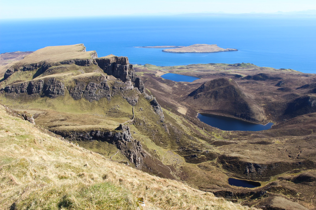 A partir de là commence un portage de 350m de dénivelé environ. En montant, on admire la géologie mais commence à se dessiner également un large sourire sur mon visage. Le single est plus que prometteur. 350m de déniv’, c’est court mais largement suffisant pour avoir un terrain très varié qui alterne entre grosses marches rocheuses avec une pente importante et un single beaucoup plus joueur sur le haut. J’ai oublié de le mentionner jusqu’ici mais comme au Quiraing, la vue est magistrale. Les photos sont là pour en témoigner.