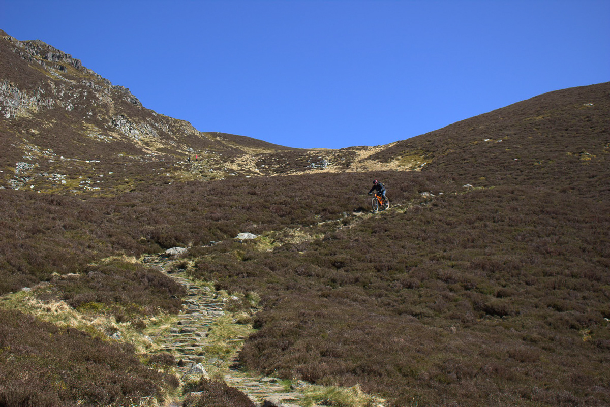 Un peu comme pour le Ben Nevis, il y a des marches plus ou moins aménagées mais cela semble plus naturel et surtout, il n’y a personne ! Je croise juste un trailer dans la montée qui lui redescend. On taille le bout de gras. Toujours aussi agréable de discuter avec les gens que l’on croise ici. Il me parle à son tour, comme tous les autres presque, de Danny Mac Askill. Ce rouquin semble être l’une des icônes du pays. Nombreux sont ceux qui m’ont demandé si je ne regardais pas un peu trop ses vidéos…En tout cas, j’ai le droit aux encouragements et les écossais semblent apprécier le fait que l’on puisse profiter de la montagne sur un 2 roues !