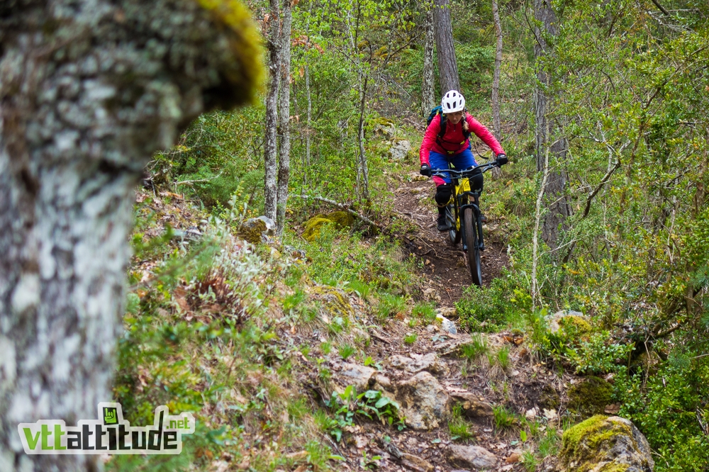 Heureusement, il en faut plus pour entacher le moral des troupes, et il faut bien redescendre sur Millau. Un peu de pédalage sur le plateau entre les pins sylvestre qui arborent le sommet, et nous arrivons au départ de l’itinéraire « le sentier du ravin » qui sera la dernière de la journée. La descente est longue, la descente est belle mais pas toujours aisée à rouler avec quelques passages engagés. Le terrain est très varié entre racines, dalles, marches, virages….et des zones plus rapides. C’est un tracé très ludique qui a été retravaillé pour le VTT et doit vraiment être excellent à rouler dans des conditions moins humides. Nous sommes ravis de terminer sur cette note là, voire un peu frustrés pour certains, comme un petit goût de reviens-y avec une grande hésitation à remonter pour prendre l’itinéraire parallèle au sentier du ravin…mais l’heure avancée ne nous permet pas de céder à la tentation.